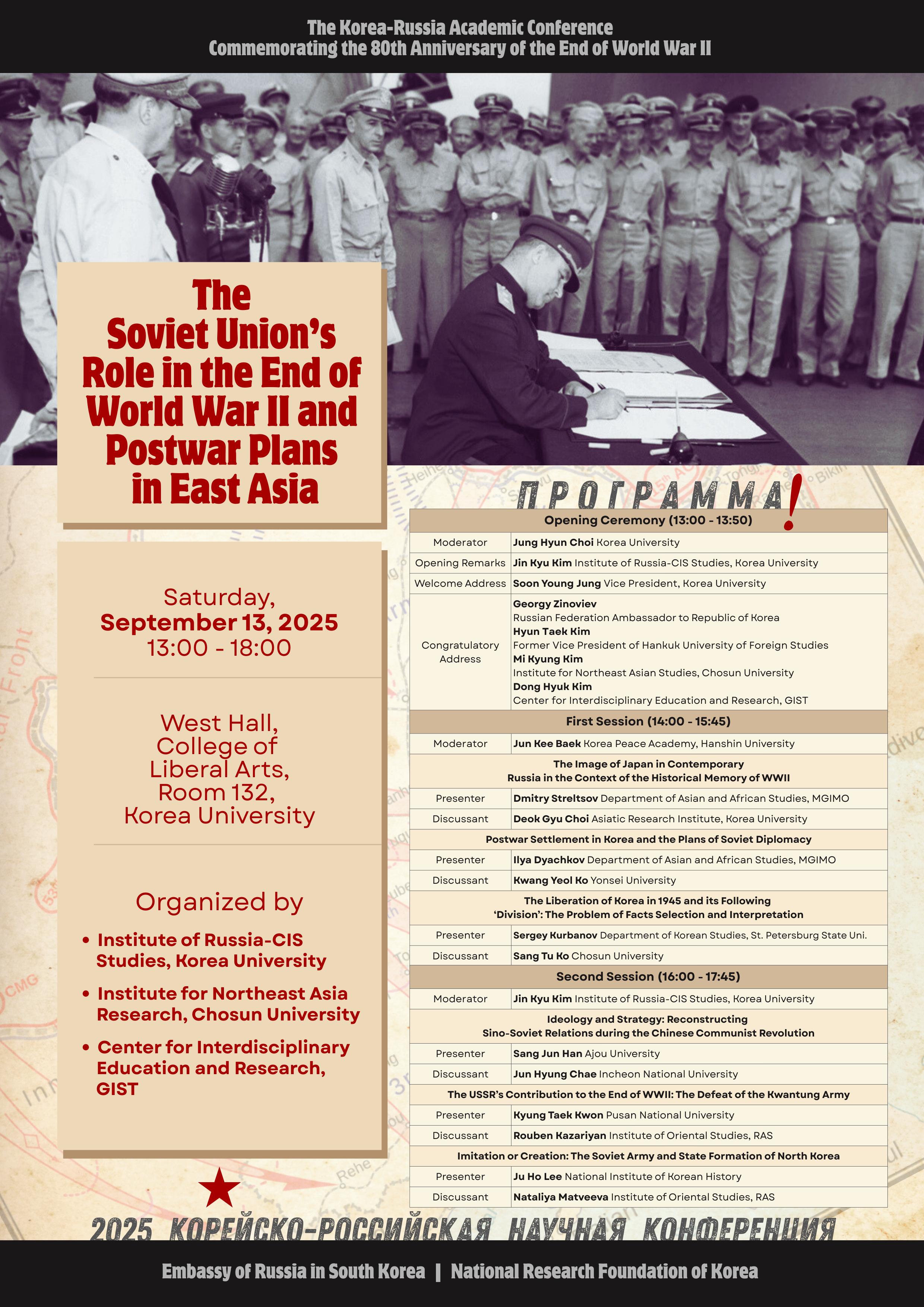 전후 동북아시아에서 당시 소련이 맡았고 수행했었던 역할에 대해 러시아 학자들의 의견도 들어볼 수 있는 흔치 않은 기회가 될 것입니다.